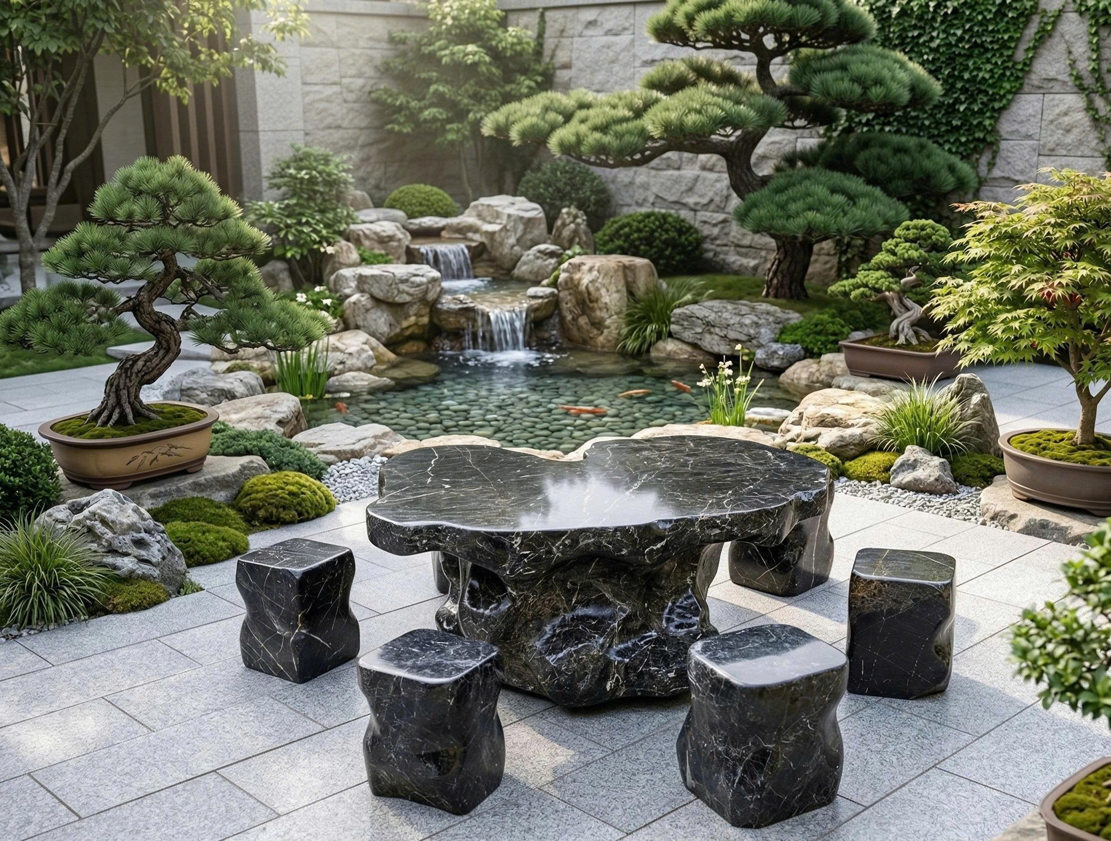 Bộ bàn ghế đá cẩm vân gồm 1 bàn và 6 đôn, dk 1.5m