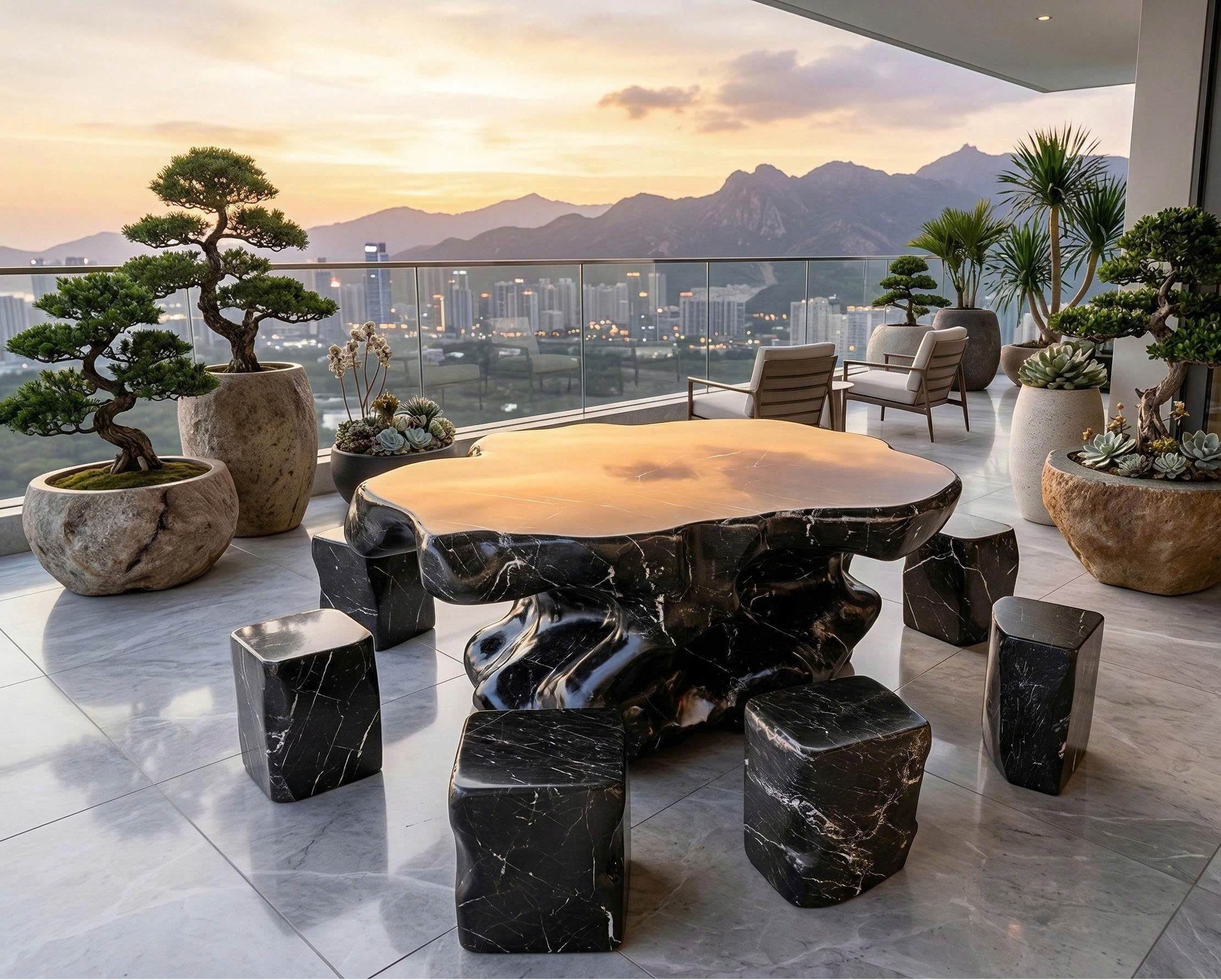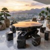 • Bộ bàn ghế đá trong hình mang phong cách nguyên khối tự nhiên, mặt bàn dạng phiến đá lớn với các đôn đá nhỏ xung quanh. Khi trưng bày một bộ bàn ghế như vậy trong sân vườn, ban công hoặc khu nghỉ dưỡng, nó thường mang nhiều ý nghĩa về thẩm mỹ, phong thủy và giá trị sống