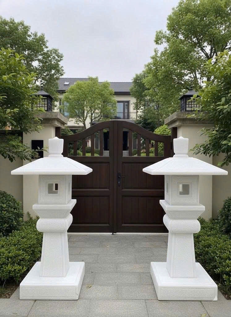 • Trụ được chế tác từ đá trắng nguyên khối, thiết kế theo phong cách đèn đá sân vườn với phần mái vuông thanh thoát, thân trụ vững chãi và ô lấy sáng ở giữa. Tạo nên vẻ đẹp trang nhã, sang trọng và hài hòa với không gian sân vườn mát mẻ