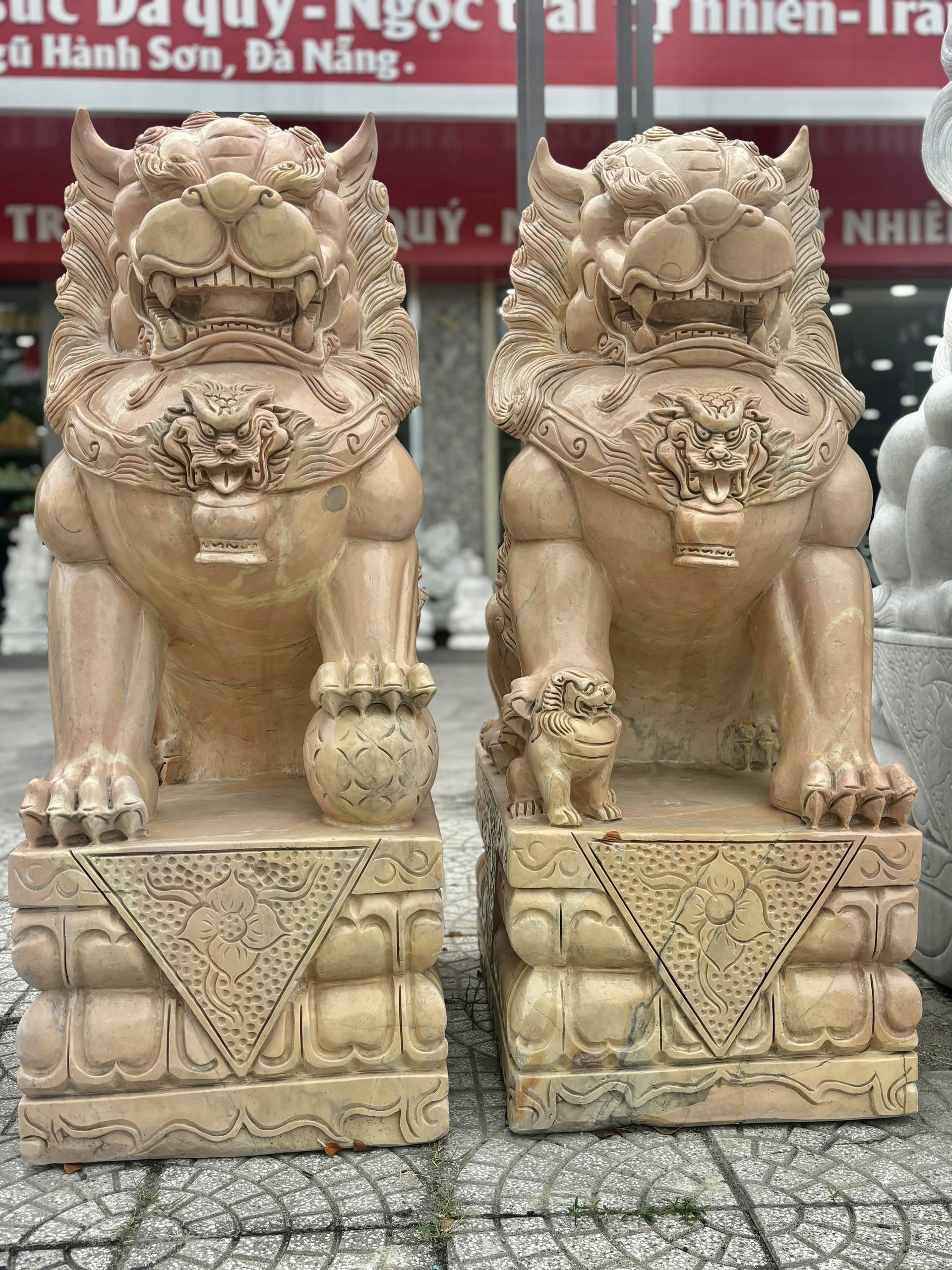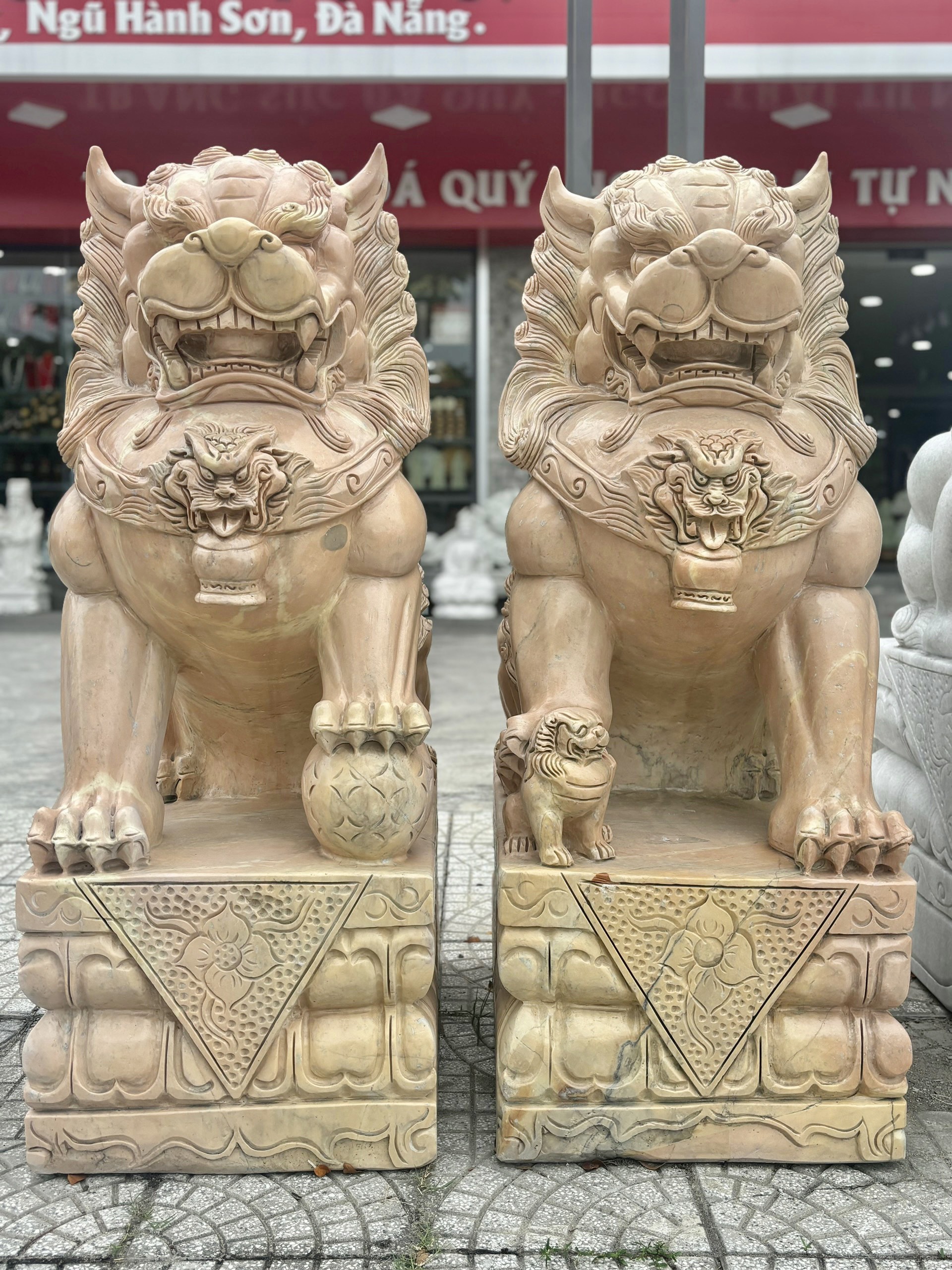 Tượng điêu khắc cặp kỳ lân đá carot nguyên khối cao 1M20 : kỳ lân trông rất hung hãn, dữ tợn nhưng lại toát lên thần khí oai nghiêm, kiêu hãnh, tự tin và đầy sức mạnh. kỳ lân giúp mang lại nhiều tài lộc và nhiều điều may mắn, giữ của không bị thất thoát mà ngày một đầy thêm.