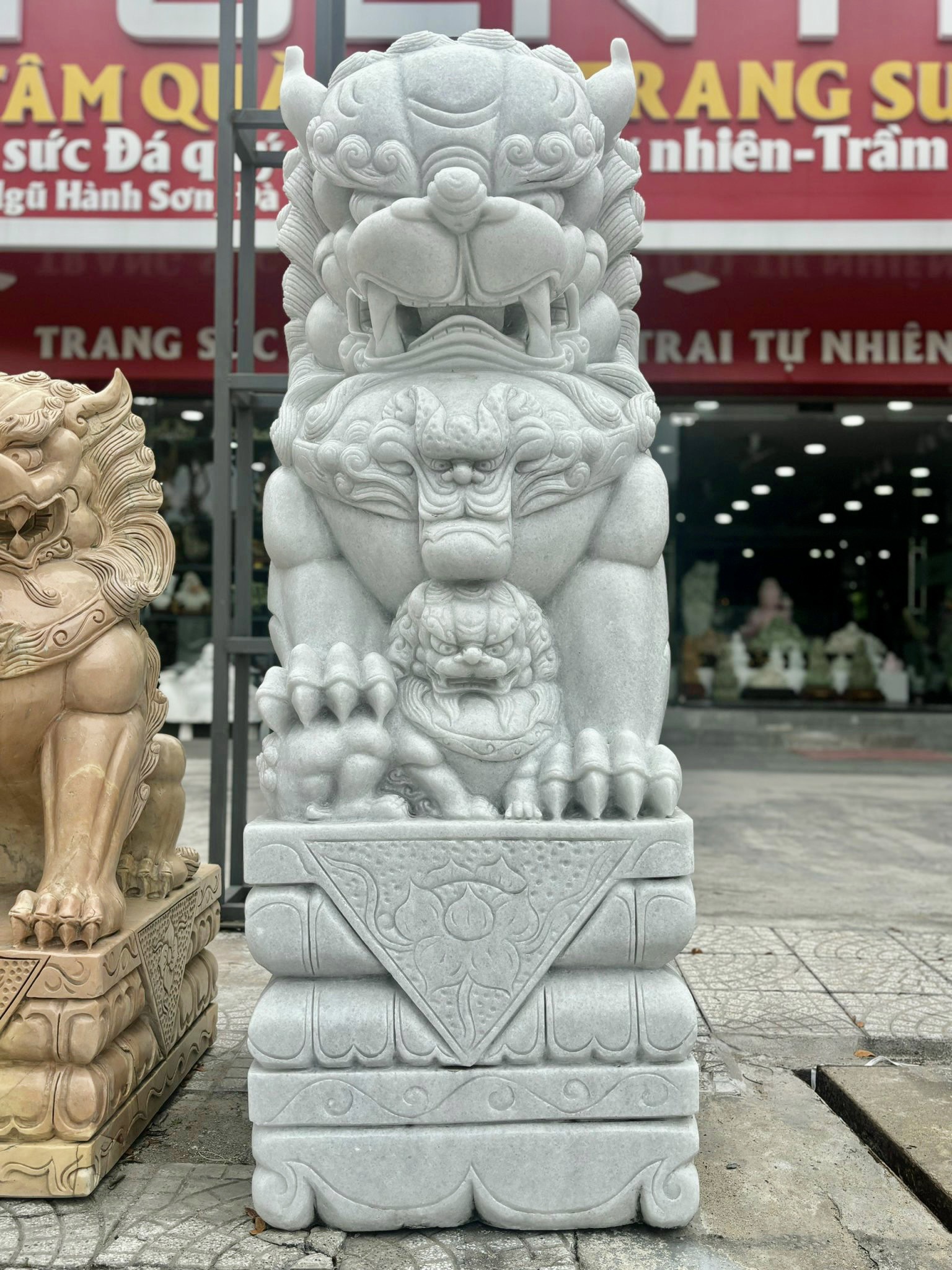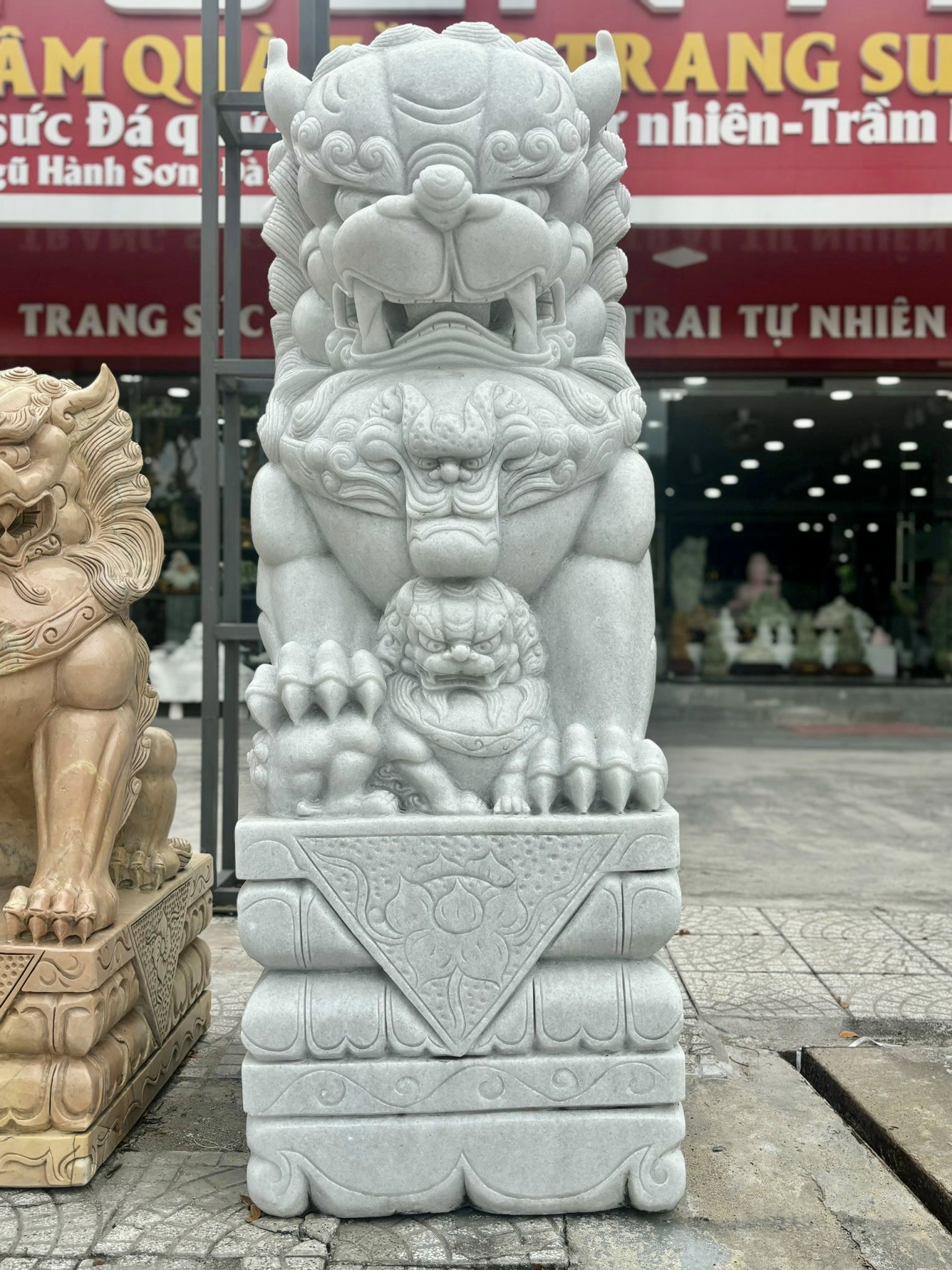 Tượng điêu khắc cặp kỳ lân đá trắng nguyên khối cao 1M70: trông rất hung hãn, dữ tợn nhưng lại toát lên thần khí oai nghiêm, kiêu hãnh, tự tin và đầy sức mạnh. giúp mang lại nhiều tài lộc và nhiều điều may mắn, giữ của không bị thất thoát mà ngày một đầy thêm.