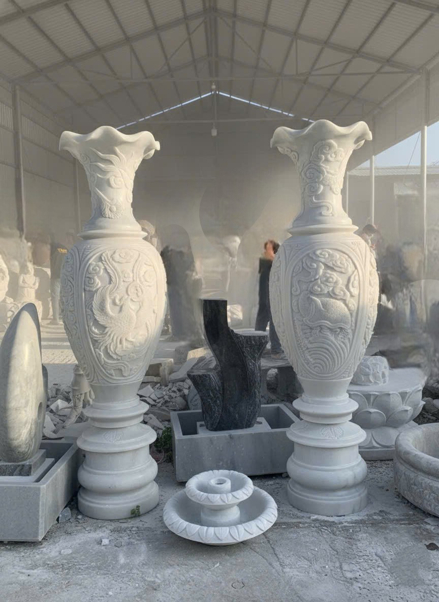 Cặp lục bình (lộc bình) đá trắng tượng trưng cho sự thuần khiết, sang trọng, có ý nghĩa chiêu tài lộc, tích tụ vượng khí và bảo quản của cải cho gia chủ nhờ thiết kế thân phình, cổ thắt