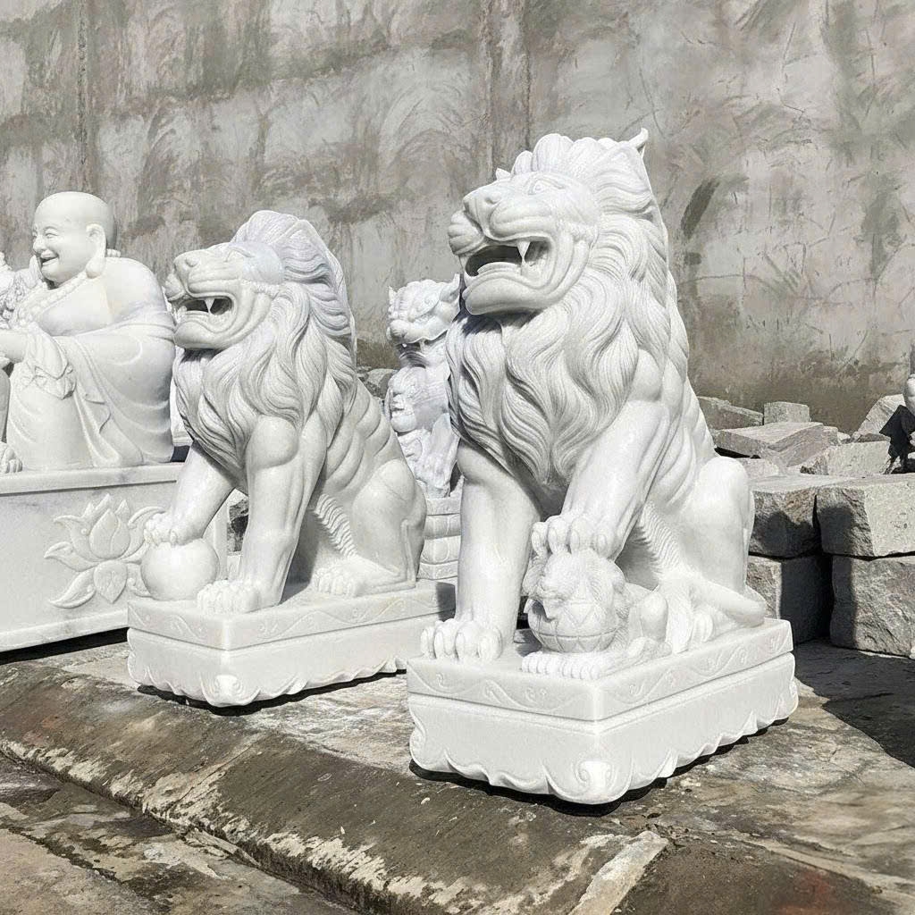 • Tượng Sư Tử đá trắng mang hình dáng uy nghi, bờm tóc uốn lượn mạnh mẽ, thế ngồi vững chãi trên bệ đá, một chân đặt lên quả cầu tạo điểm nhấn sang trọng và bề thế. Các chi tiết được chạm khắc thủ công tinh xảo, thể hiện thần thái dũng mãnh và trang trọng.