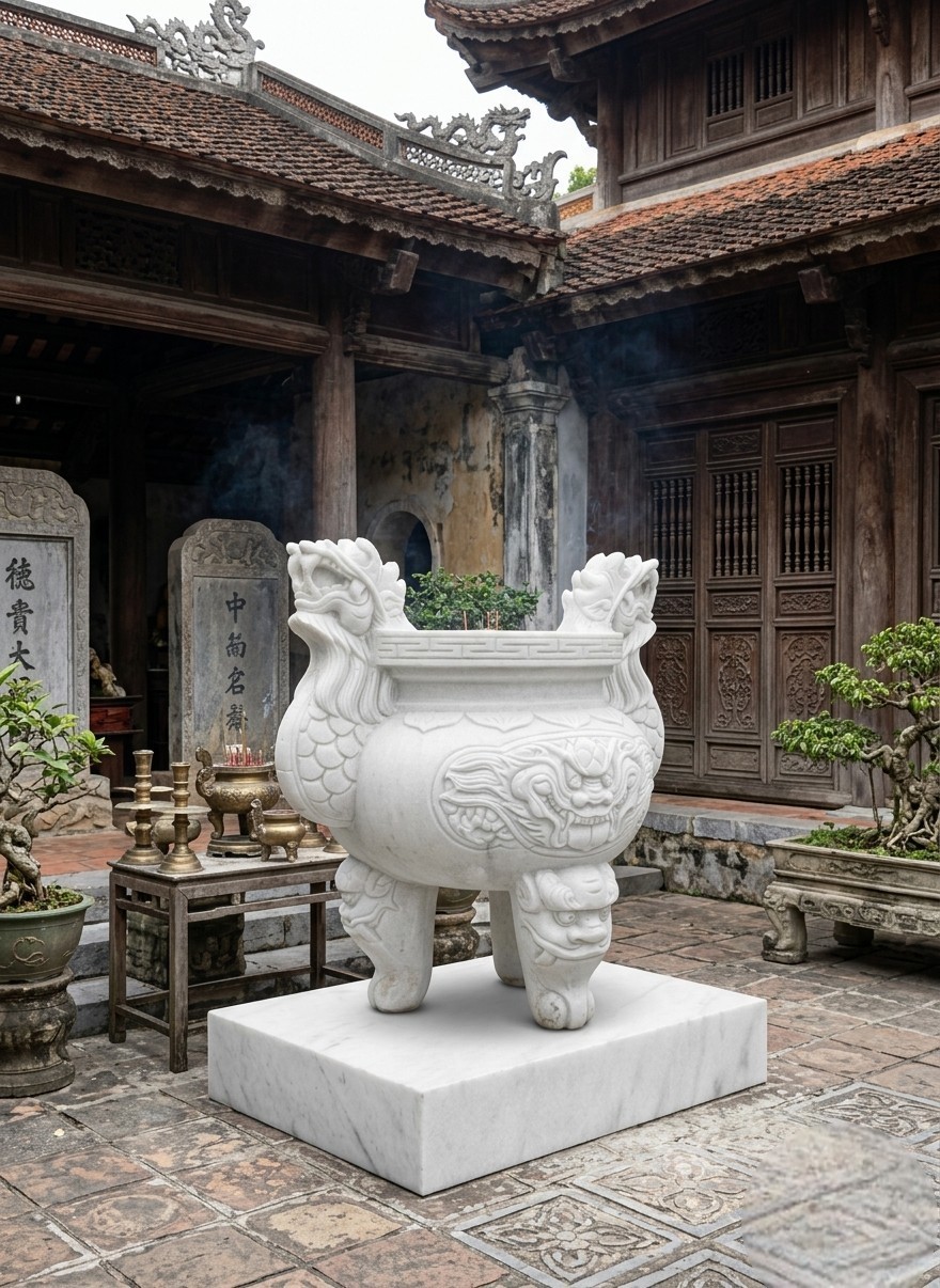 Lư hương quan âm đá trắng (thường bằng đá cẩm thạch trắng) tượng trưng cho sự thuần khiết, thanh cao và lòng từ bi của Phật Bà, giúp không gian thờ cúng thêm trang nghiêm, thanh tịnh. Sản phẩm mang ý nghĩa phong thủy cầu bình an, may mắn, xua đuổi tà khí và hóa giải hung khí, đặc biệt được ưa chuộng tại chùa, đền và bàn thờ gia tiên.