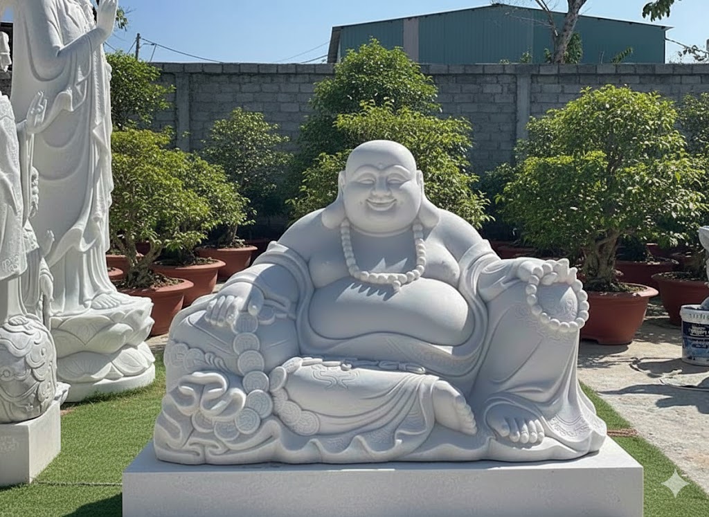 • Bức tượng trong ảnh là Tượng Phật Di Lặc ngồi trên bao tiền (hay còn gọi là Phật Di Lặc tài lộc), được tạc hoàn toàn từ đá trắng tự nhiên nguyên khối. Đây là một trong những dáng tượng Phật Di Lặc phổ biến và được ưa chuộng nhất trong phong thủy, biểu tượng cho niềm vui, may mắn và sự sung túc