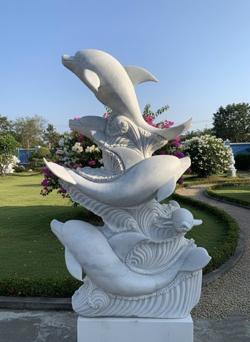 • Tháp nước (đài phun nước) hình cá chép đá trắng mang ý nghĩa sâu sắc về sự kiên trì, vượt khó thành công (hóa rồng), tài lộc dồi dào và may mắn, thường được đặt để chiêu tài khí, tăng vượng khí cho không gian. Chất liệu đá trắng tự nhiên giúp thanh lọc năng lượng xấu, mang lại bình an, trong khi nước chảy liên tục tượng trưng cho nguồn tài lộc bền vững.