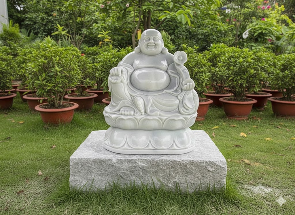 Tượng Phật Di Lặc bằng đá trắng có thể đặt ở: Phòng khách: Mang lại năng lượng tích cực, thu hút tài lộc. Sảnh công ty, cửa hàng: Gọi may mắn, tạo không khí vui tươi cho không gian làm việc. Sân vườn, khuôn viên chùa, biệt thự: Tăng vẻ trang nghiêm và bình an.