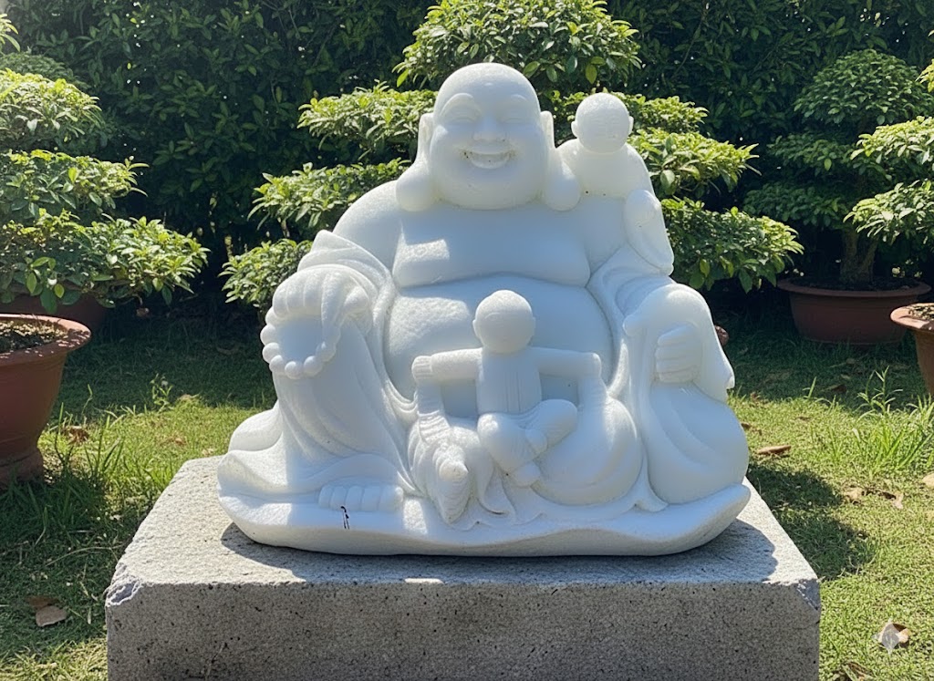 • Tượng thể hiện Phật Di Lặc ngồi thoải mái, nụ cười hiền hậu, xung quanh là các tiểu đồng đang vui đùa trên người Ngài. Hình ảnh này vừa hóm hỉnh, vừa chan chứa tình thương, thể hiện tinh thần hỷ xả, bao dung và niềm vui bất tận.