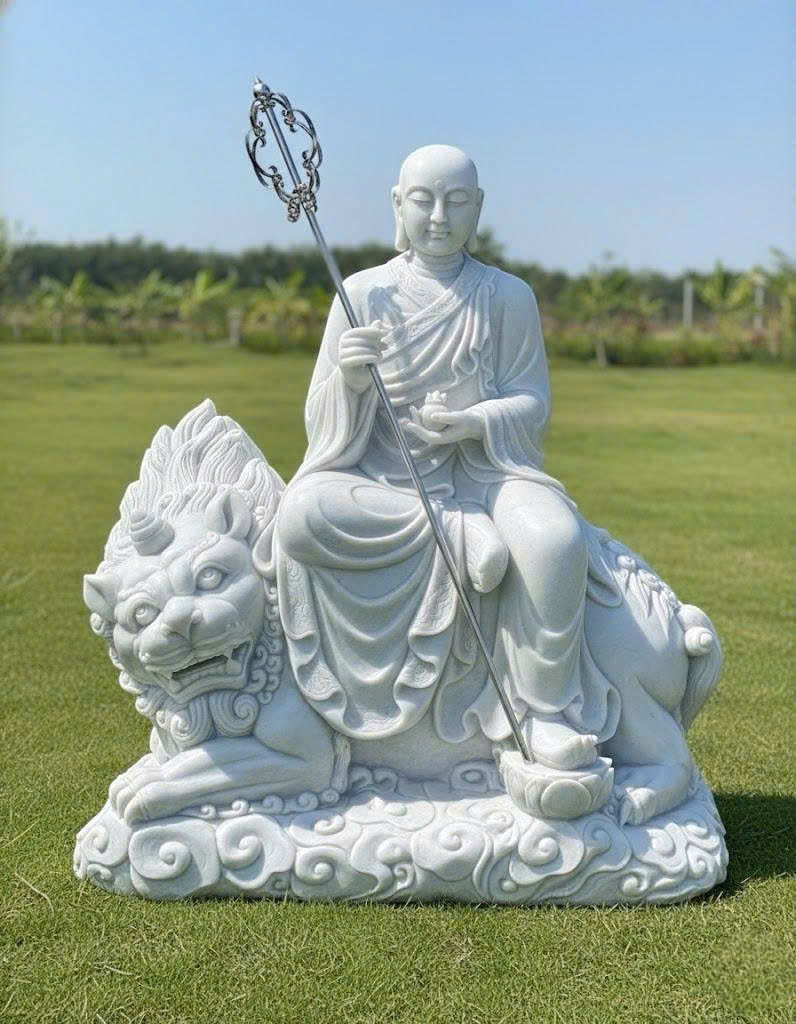 • Tượng Địa Tạng Vương Bồ Tát cưỡi Đề Thính Đá Trắng Nguyên Khối Cao 1.8M T309