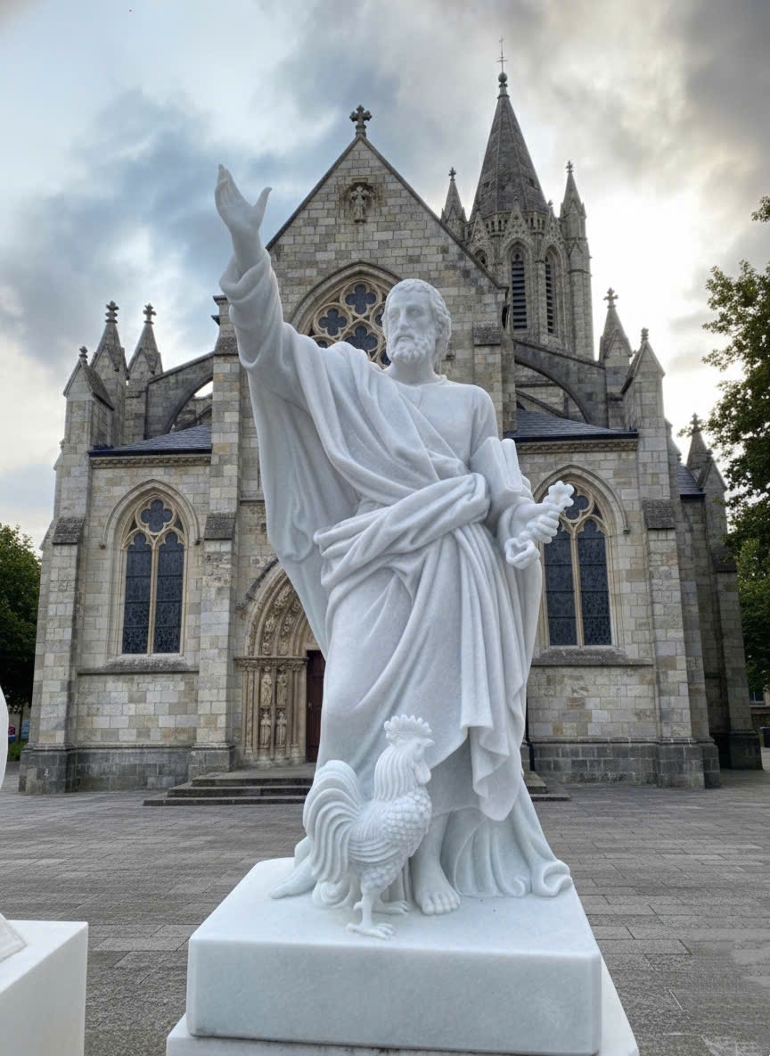 Tượng Thánh Phêrô bằng đá trắng tượng trưng cho vị Giáo hoàng đầu tiên, người nắm giữ chìa khóa Thiên Đàng (quyền bính Giáo hội) và là đá tảng vững chắc của đức tin Công giáo. Chất liệu đá trắng thể hiện sự tinh khiết, trang nghiêm và tôn vinh sự thánh thiện của Ngài.