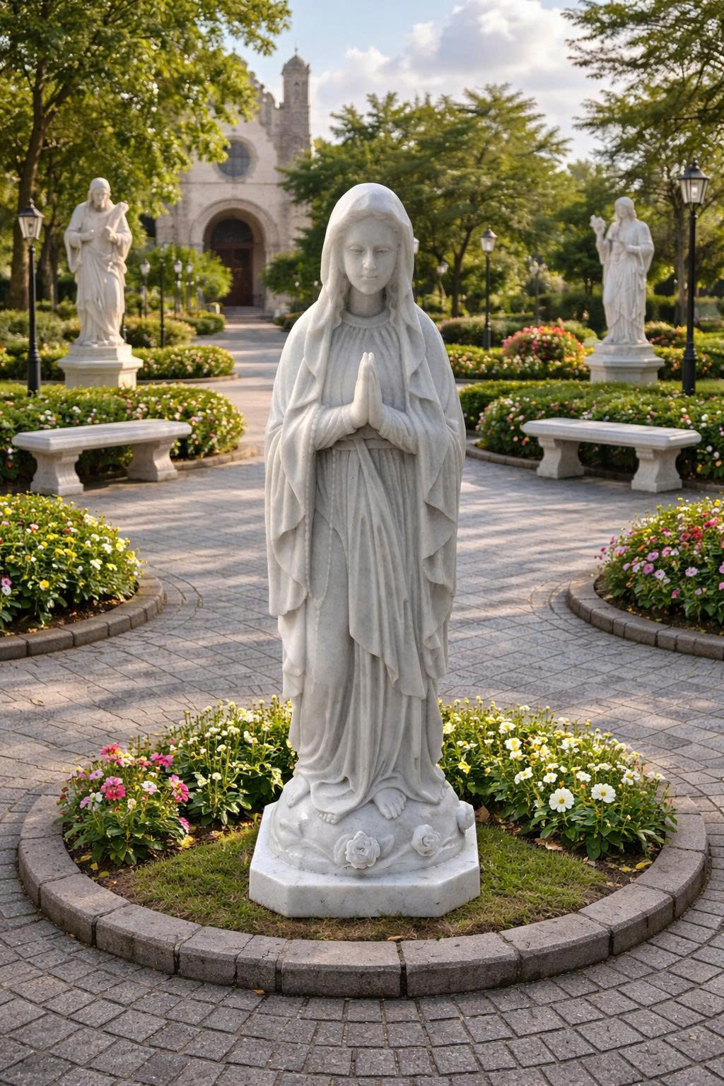 • Bức tượng khắc họa Đức Mẹ trong tư thế , hai tay chắp trước ngực thể hiện sự cầu nguyện và khiêm nhường.Gương mặt Mẹ hiền hòa, ánh nhìn nhẹ nhàng và đầy yêu thương.Áo choàng dài phủ mềm mại, các nếp vải được chạm khắc tinh tế.Tượng đứng trên bệ đá trang trí hoa hồng, biểu tượng của sự tinh khiết