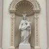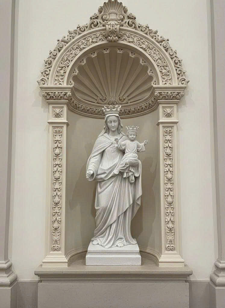• Tượng Đức Mẹ Maria bồng Chúa Giêsu hài đồng bằng đá trắng nguyên khối, với gương mặt Đức Mẹ hiền từ, ánh nhìn dịu dàng và đầy yêu thương. Chúa Hài Đồng cũng đội vương miện, một tay giơ lên như ban phúc lành. Các nếp áo được chạm khắc mềm mại, uyển chuyển.
