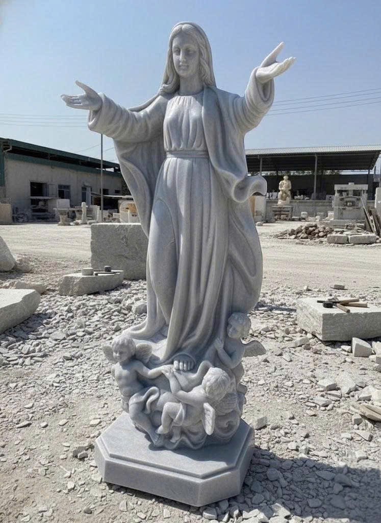 • Tượng được tạc bằng đá trắng tự nhiên, kiểu dáng mềm mại, đường nét tinh sảo. Đức Mẹ đứng thẳng, hai tay dang rộng, lòng bàn tay hướng ra phía trước – cử chỉ chào đón và ban ơn.Khuôn mặt hiền từ, ánh nhìn bao dung, thể hiện tình yêu thương vô điều kiện.