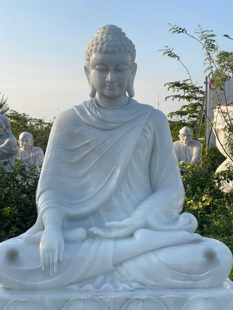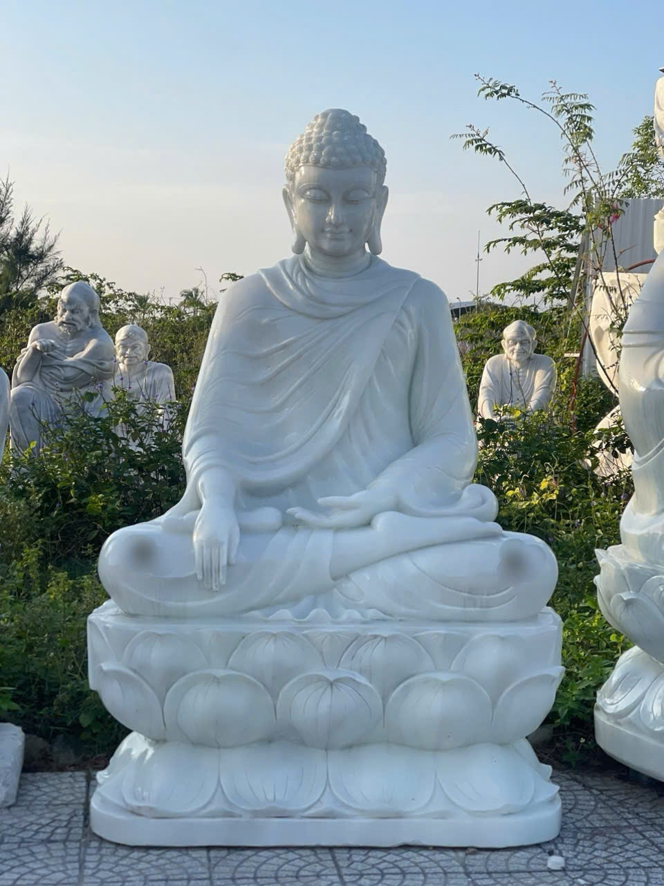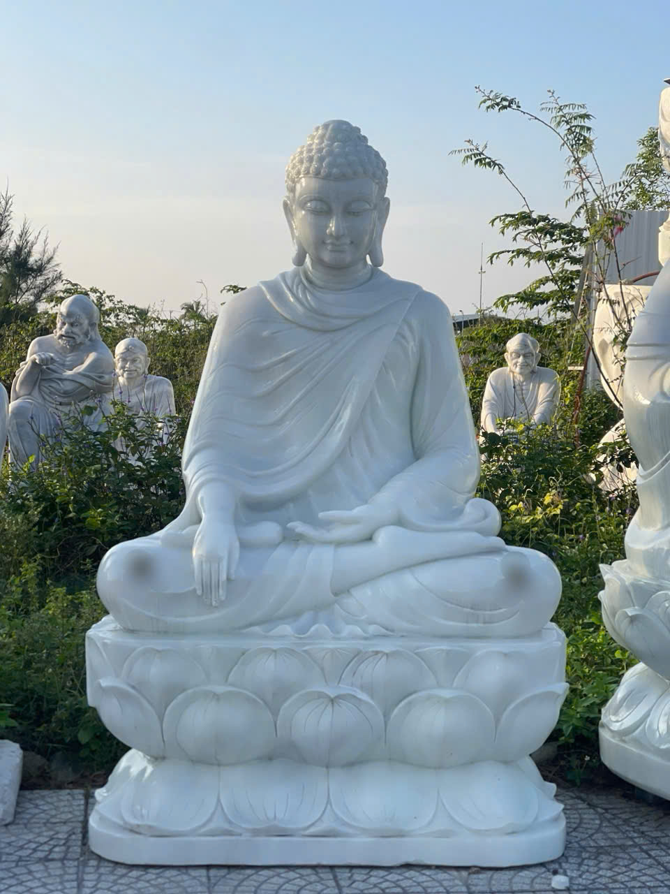 Tượng phật thích ca đá trắng nguyên khối biểu tượng sự may mắn bình an cho gia chủ