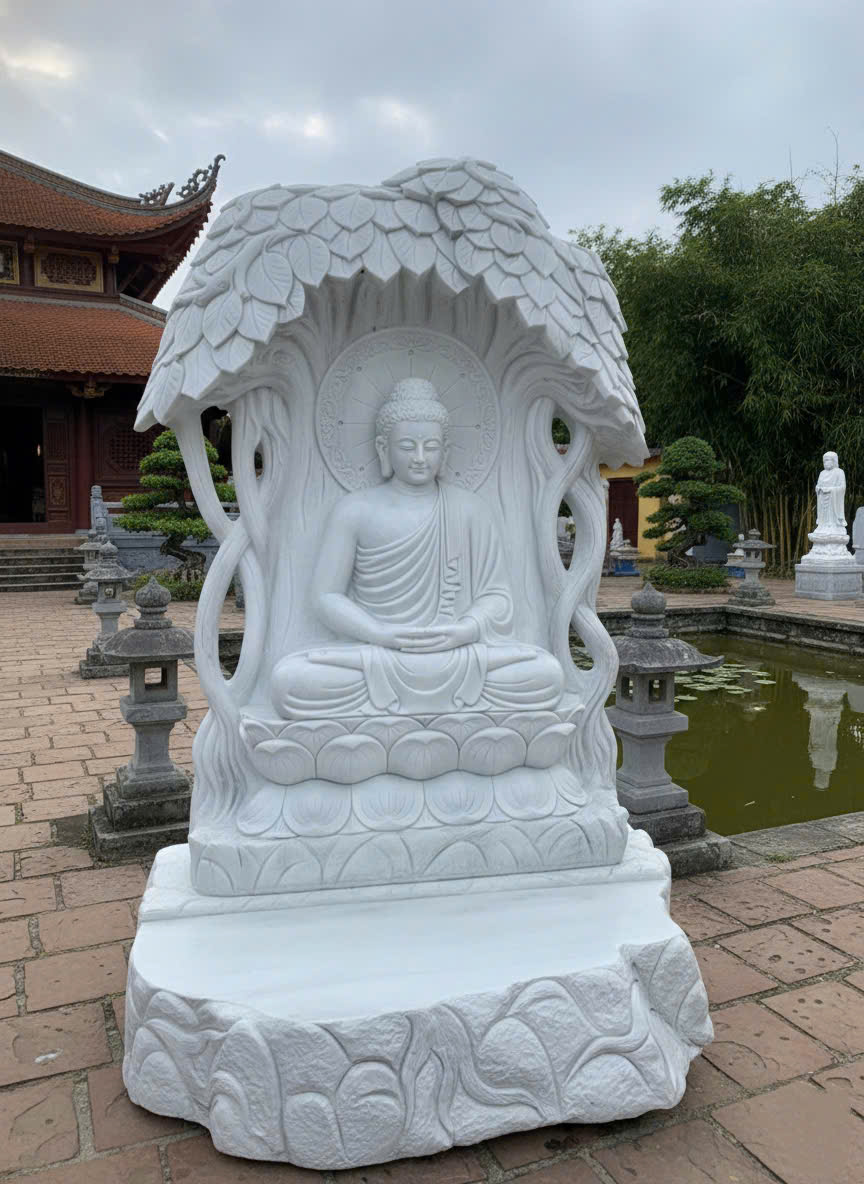 Tượng Phật Thích Ca trên nền lá bồ đề đá trắng tượng trưng cho sự giác ngộ, bình an và trí tuệ cao thượng. Sự kết hợp giữa hình ảnh Đức Phật, lá bồ đề (nơi thành đạo) và đá trắng (sự thuần khiết) mang ý nghĩa che chở, giúp tâm hồn thanh tịnh, xua đuổi tà ma, và thu hút may mắn, tài lộc cho người sở hữu.