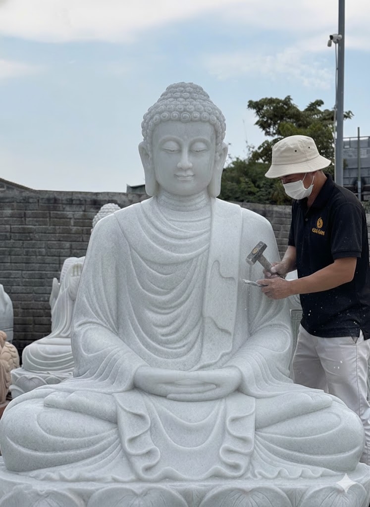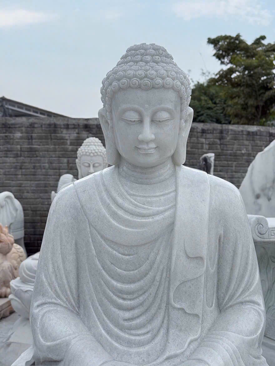 Tượng Phật thích ca ngồi được chế tác tinh xảo từ đá trắng nguyên khối tự nhiên.biểu trưng cho sự thanh tịnh và giác ngộ. thể hiện thần thái từ bi, an nhiên và trí tuệ của Đức Phật