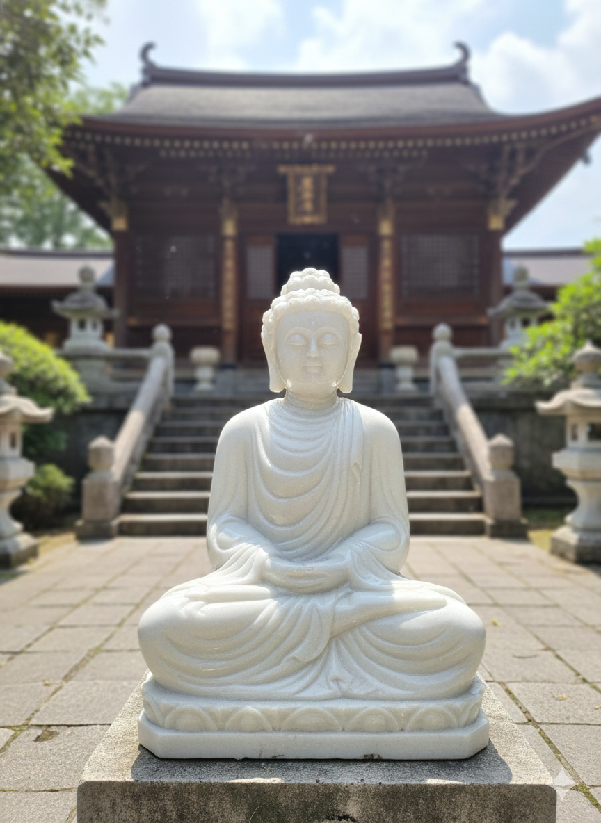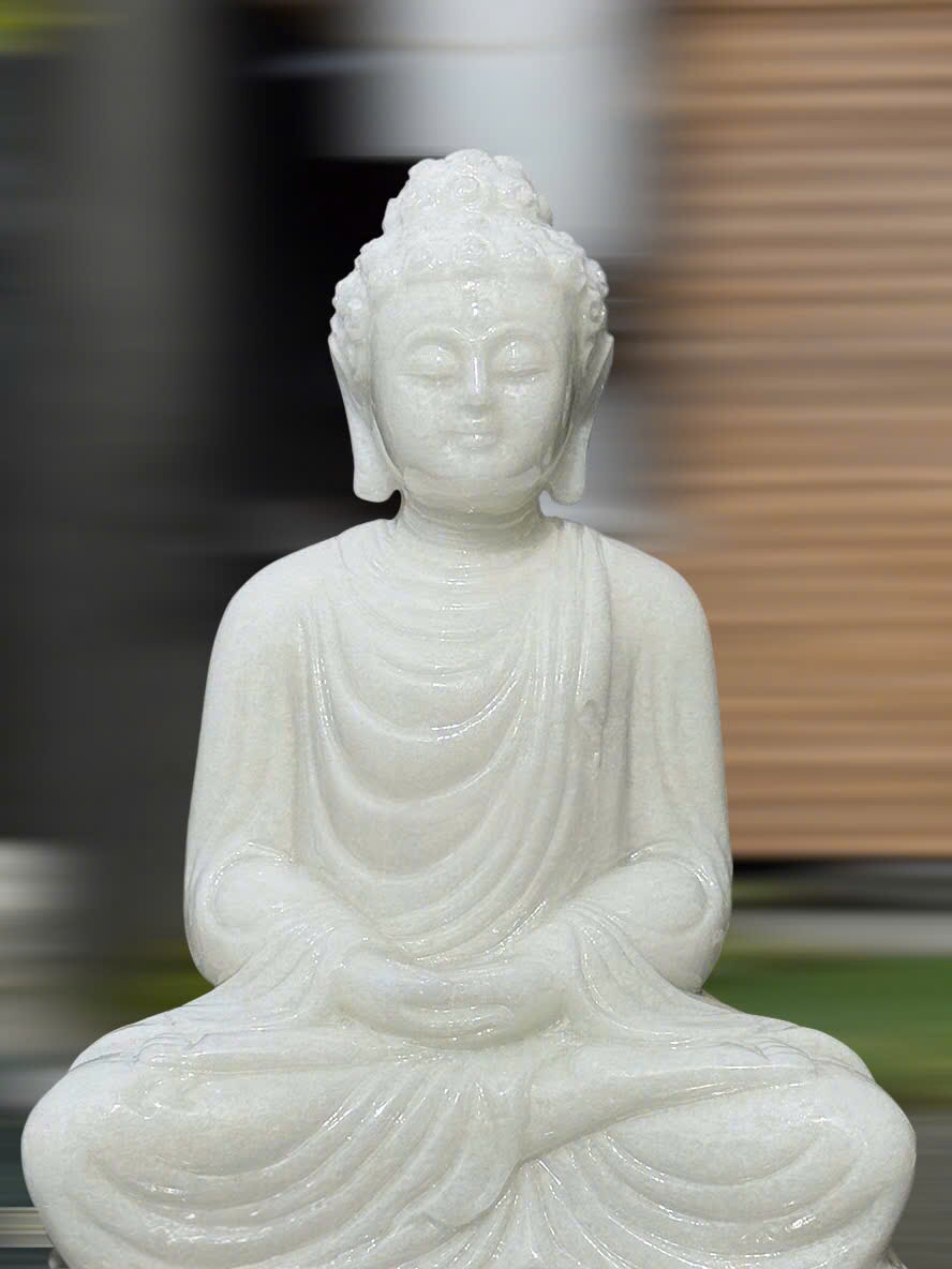 Tượng Phật Thích Ca ngồi được chế tác tinh xảo từ đá trắng nguyên khối tự nhiên.biểu trưng cho sự thanh tịnh và giác ngộ. thể hiện thần thái từ bi, an nhiên và trí tuệ của Đức Phật