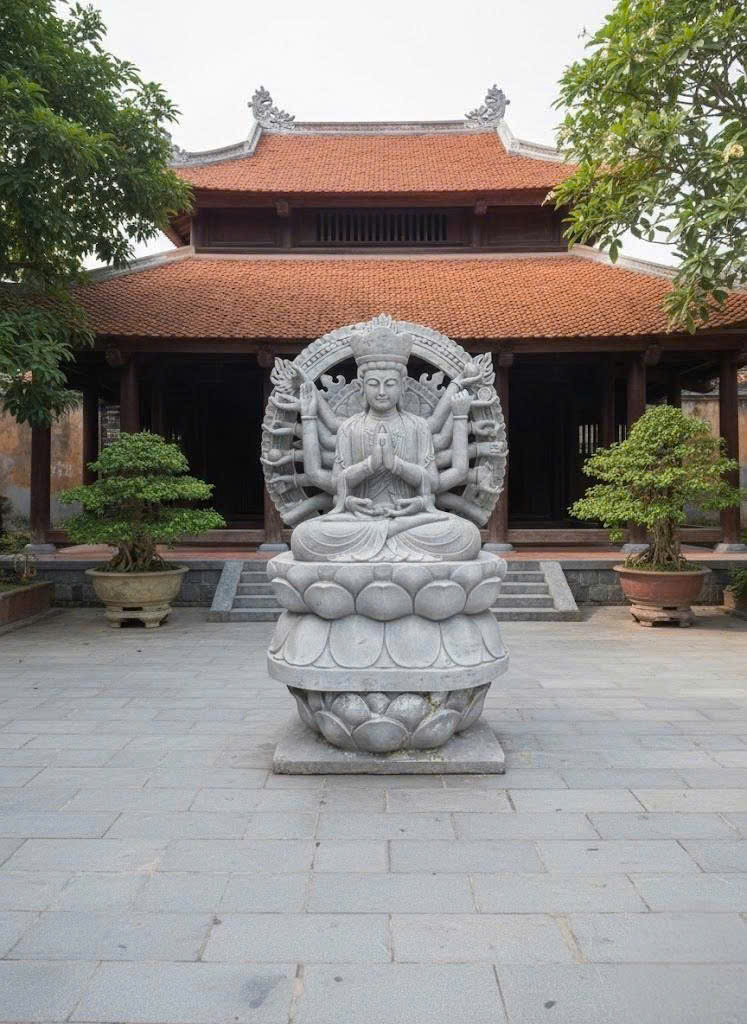 Bức tượng trong hình được tạc ngồi trên đài sen – biểu tượng của sự thanh khiết và giác ngộ, phía sau là hào quang nghìn tay xòe rộng, tạo nên vẻ trang nghiêm và linh thiêng cho không gian chùa.