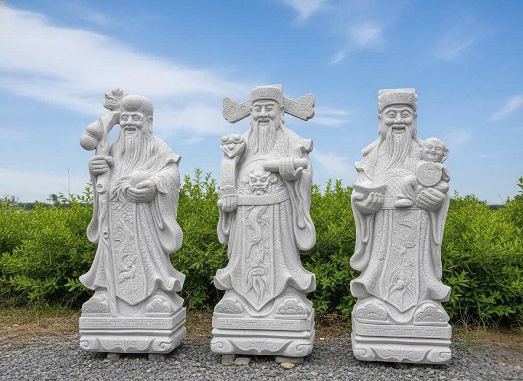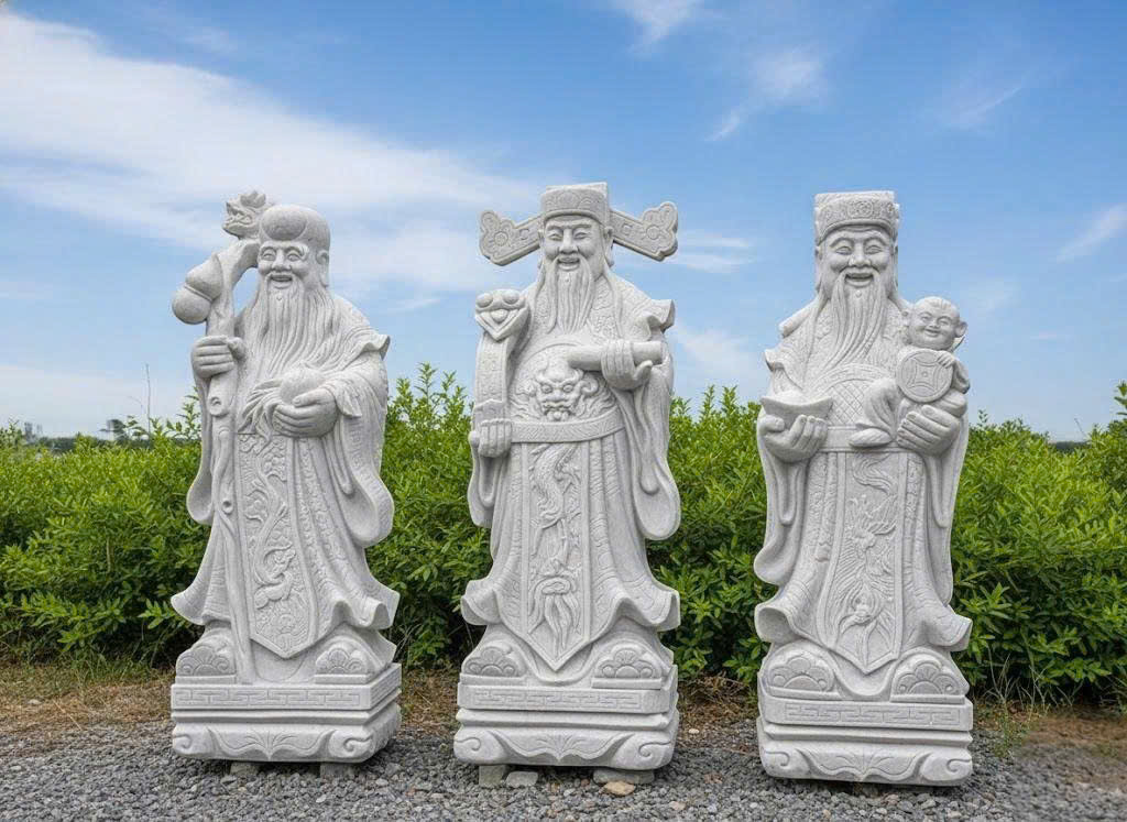 Bức ảnh là tượng Tam Đa (Phúc – Lộc – Thọ) được chế tác từ đá trắng nguyên khối, đặt ngoài trời với phong cách chạm khắc tinh xảo, đường nét mềm mại và thần thái hiền hòa.