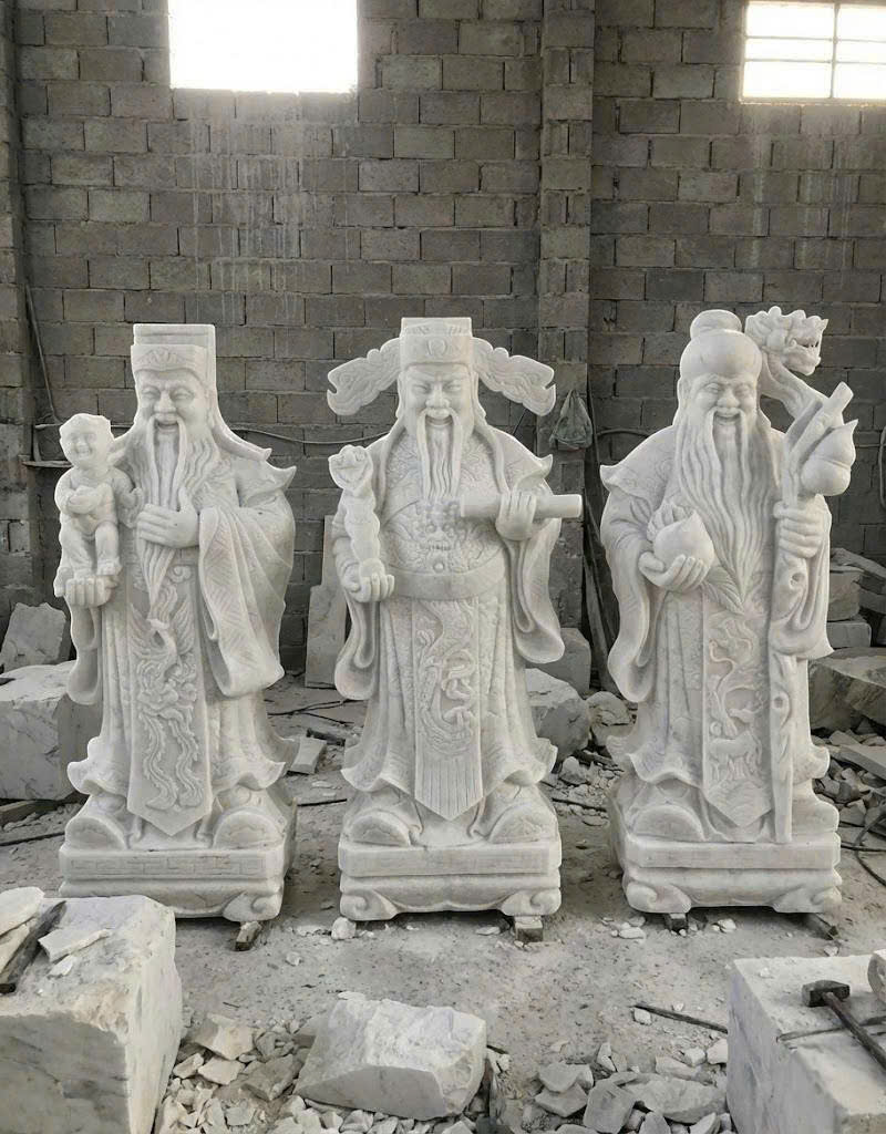 Bức ảnh là tượng Tam Đa Phúc – Lộc – Thọ được chế tác từ đá trắng.