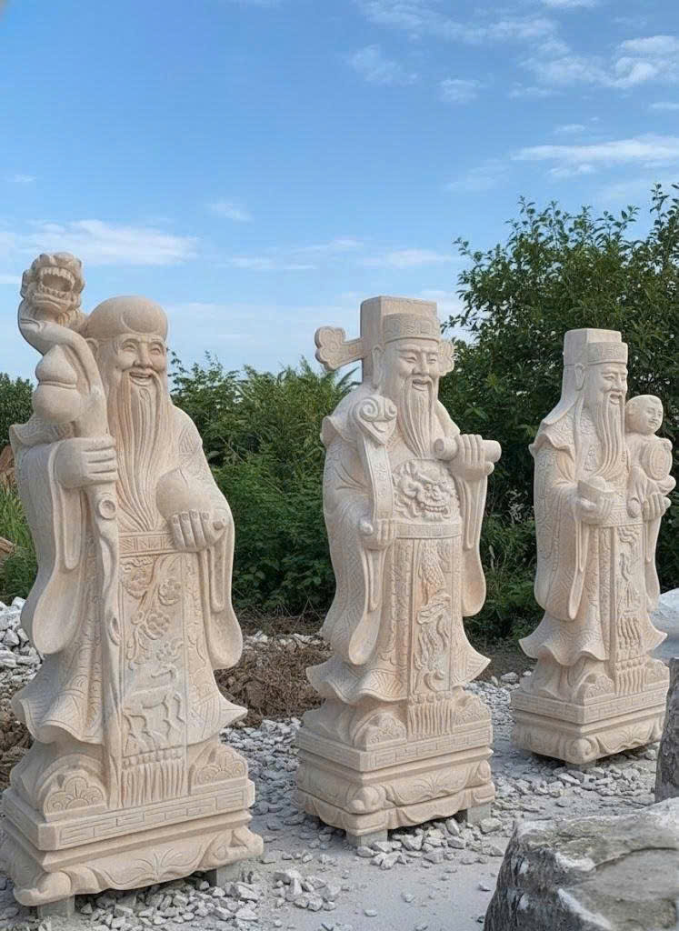 • Ba bức tượng đứng trên bệ đá vững chãi, dáng vẻ uy nghi, khuôn mặt hiền từ, râu dài thể hiện sự phúc hậu và trí tuệ. Tượng được điêu khắc mềm mại, họa tiết áo và bệ đá sắc nét, thể hiện tay nghề thủ công cao cấp. Chất đá sáng màu giúp không gian trở nên sang trọng và trang nghiêm.