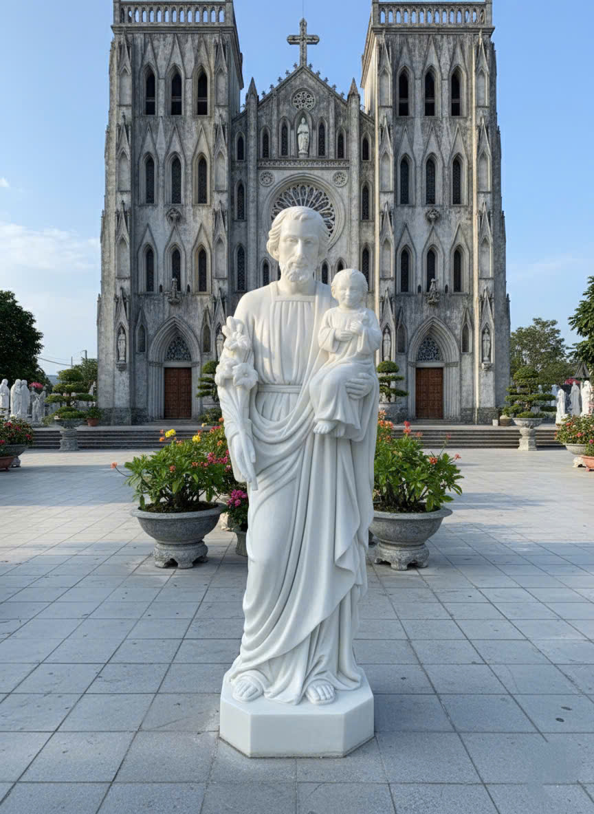 Tình phụ tử và sự che chở: Tượng khắc họa Thánh Giuse ôm ấp Chúa Hài Đồng, thể hiện tình yêu thương, sự chăm sóc và bảo vệ tuyệt đối của người cha nuôi đối với Con Thiên Chúa.
