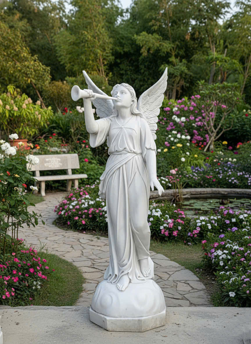 • Tượng thiên thần thổi loa bằng đá trắng (thường là cẩm thạch trắng) mang ý nghĩa cao đẹp về việc truyền tin vui, sứ giả bình an và tôn vinh cái đẹp. Tượng biểu trưng cho sự kết nối giữa trời và đất, mang lại niềm hy vọng, sự bảo vệ và tạo không gian thanh thản, thiêng liêng cho không gian đặt tượng.