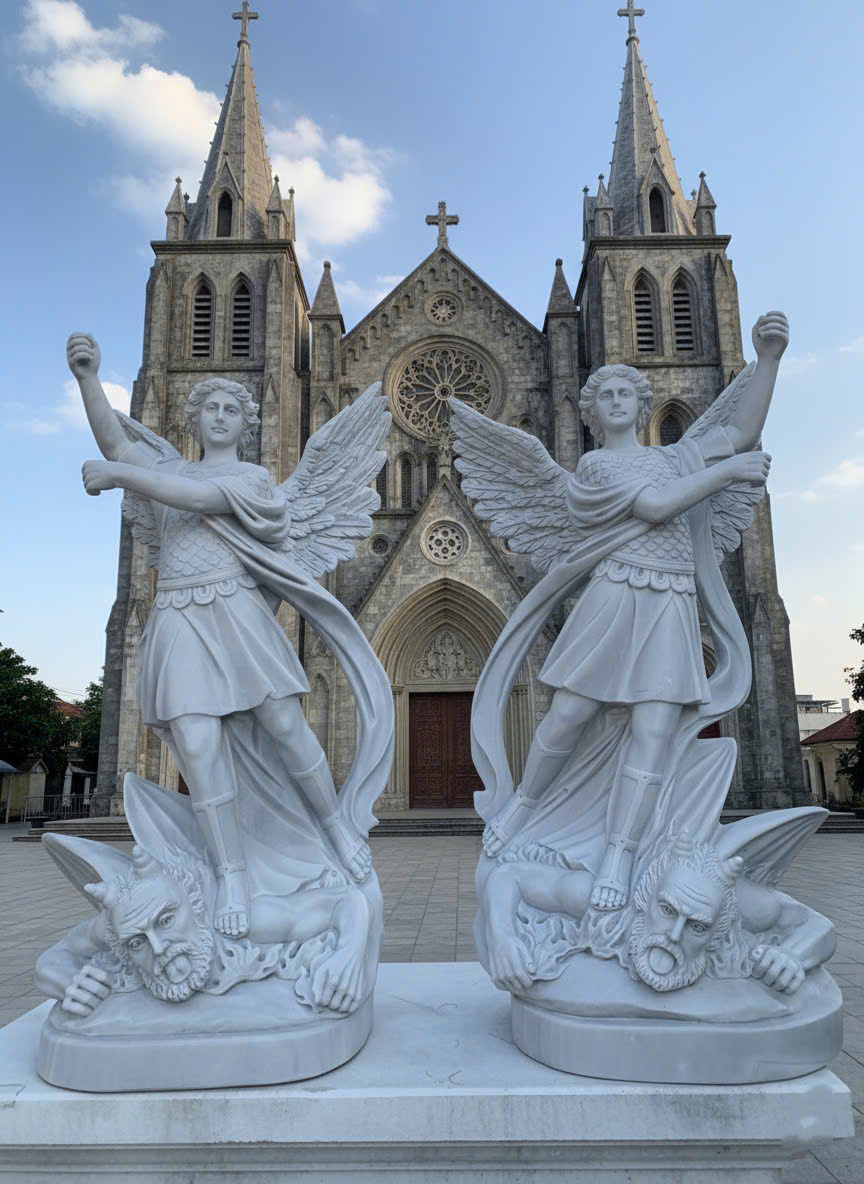 Tượng Tổng Lãnh Thiên Thần bằng đá trắng thường phổ biến với hình ảnh Thánh Micae diệt quỷ, thể hiện lòng dũng cảm và sự chiến thắng cuối cùng của Thiên Chúa.