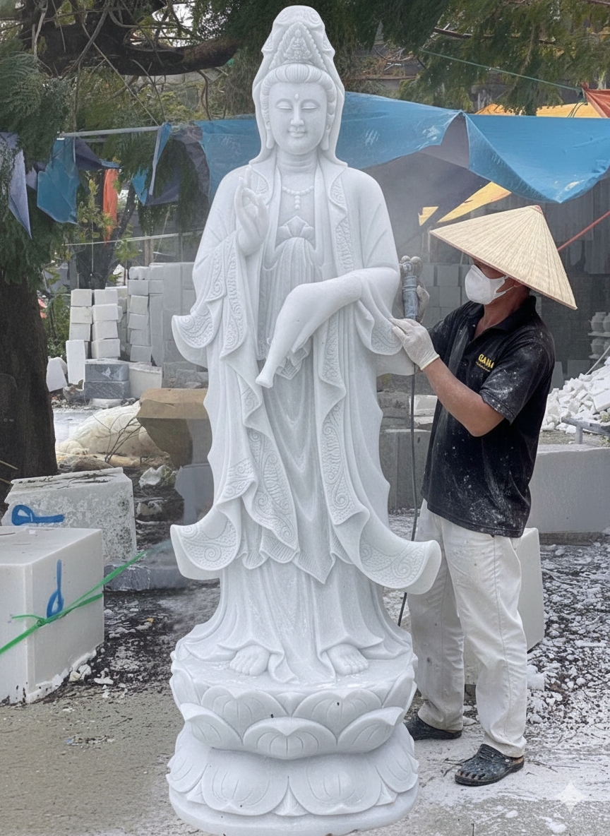 Tượng Phật Bà Quan Thế Âm Bồ Tát không chỉ là một tác phẩm nghệ thuật điêu khắc mà còn là biểu tượng của lòng từ bi, sự bình an và cứu khổ cứu nạn. Tại Xưởng Điêu Khắc Đá Mỹ Nghệ Gia Hân, chúng tôi tự hào mang đến bộ sưu tập hơn 100+ mẫu tượng Quan Âm bằng đá trắng nguyên khối, được chế tác thủ công bởi những nghệ nhân bậc thầy tại làng nghề Non Nước Đà Nẵng.